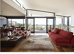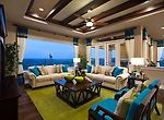 짙은 갈색의 바닥에 더 짙은 러그를 놓고 밝은 색 소파를 배치하였습니다.