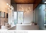 베이지색 양탄자와 스틸과 유리를 조합한 가벼운 디자인의 센터 테이블이 분위기를 완화시켰습니다.