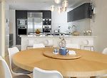 위의 예와 같이 카운터 주방과 평행하게 직사각형 6인용 식탁을 배치하였고 같은 방향으로 3명이 나란히 마주보며 앉아 식사를 할 수 있는 타입의 식탁으로 레이아웃의 인상이 확 다릅니다.
